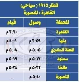 - تعديل ميعاد قيام قطار 1915 سياحي القاهرة / المنصورة ليقوم من محطة القاهرة الساعة 3:20 مساءاً بدلاً من الساعة 5:10 مساءاً ليصل محطة المنصورة الساعة 5:40 مساءاً