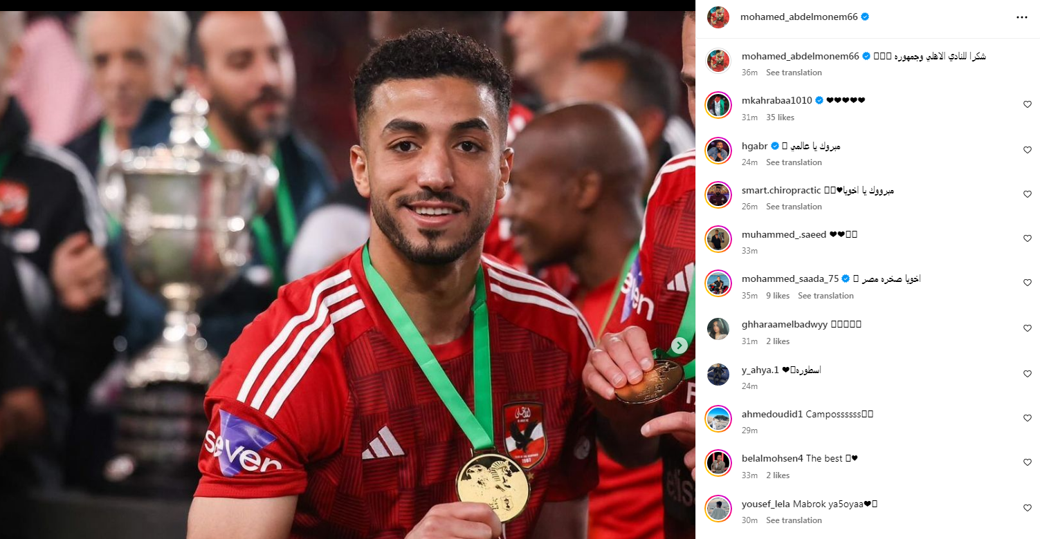 تحيا مصر، وكتب محمد عبد المنعم لاعب الفريق الأول لكرة القدم بالقلعة الحمراء على حسابه الرسمي"إنستجرام:" شكراً للنادي الأهلي وجمهوره".