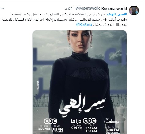 جدير بالذكر، أنه يعرض مسلسل سر إلهي بطولة النجمة روجينا، خلال شهر رمضان الجاري حصريا على شاشة قناة CBC، من تأليف أمين جمال، وإخراج رؤوف عبد العزيز، وإنتاج كودكس، وتدور أحداث العمل إطار اجتماعي شعبي، مليء بالتشويق، حيث يحكي العمل، قصة نصرة وتجسدها روجينا فى الأحداث، التي تواجه الحياة بمفردها بعد غدر أقرب الأشخاص إليها، وتقرر الانتقام ممن ظلمها.