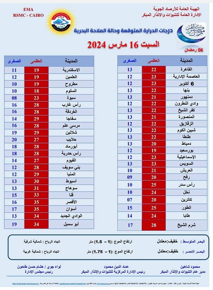 واعلنت هيئة الأرصاد الجوية عن درجات الحرارة غدا السبت من خلال بيان رسمي عبر صفحتها الرسمية على مواقع التواصل الاجتماعى ورصدها تحيا مصر فى السطور التالية: