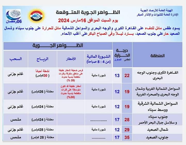 درجات الحرارة المتوقعة غدا السبت 16 مارس 2024 الموافق 6 رمضان على القاهرة العظمى 22 درجة والصغرى 13