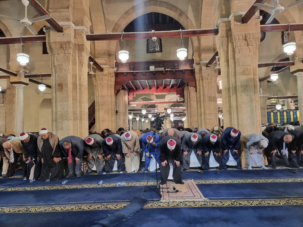 وتقدم المصلين فضيلةُ الدكتور نظير عياد، الأمين العام لمجمع البحوث الإسلامية، والدكتور إبراهيم الهدهد، عضو مجمع البحوث الإسلامية ورئيس جامعة الأزهر الأسبق، والدكتور هاني عودة، مدير عام الجامع الأزهر، والشيخ حسن عراقي، وكيل لجنة مراجعة المصحف، ونخبة من علماء وقيادات الأزهر، وتقام صلاة العشاء من سورة الأعراف برواية حفص عن عاصم، وتقام صلاة التراويح من سورة الأعراف برواية ابن وردان عن أبي جعفر المدني، ورواية الدوري عن الإمام الكسائي، ورواية رويس عن يعقوب الحضرمي.
