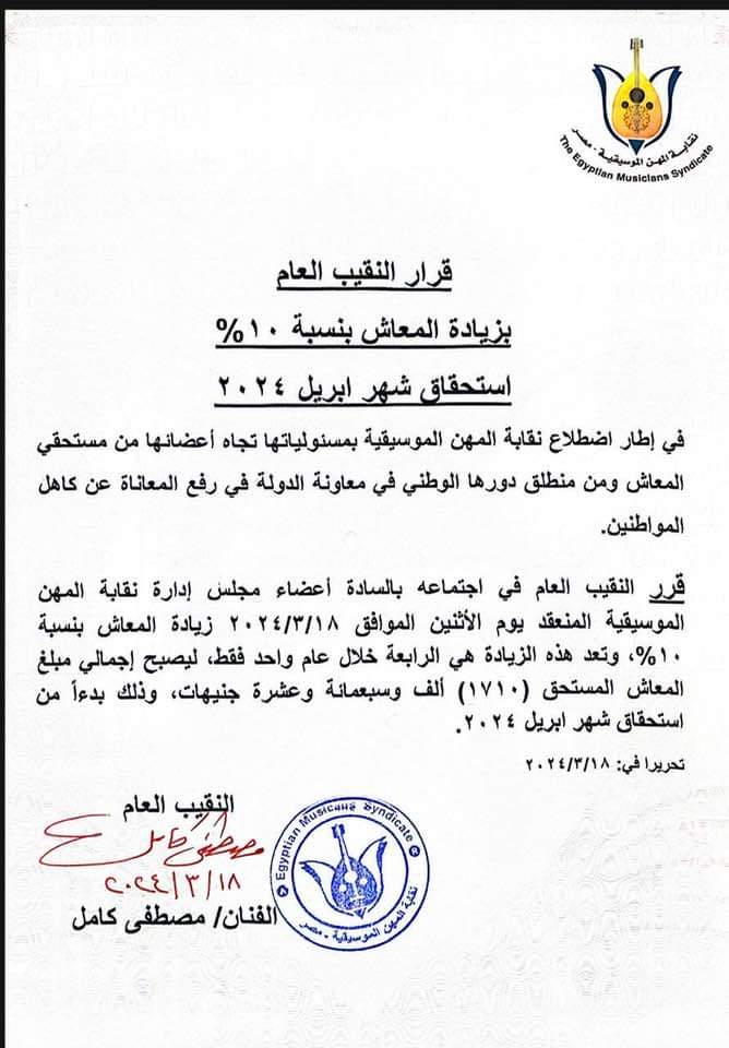 أعلن الفنان مصطفى كامل النقيب العام للمهن الموسيقية زيادة معاشات الأعضاء بنسبة 10% للمرة الرابعة خلال عام واحد، ليصبح إجمالي مبلغ المعاش المستحق 1710 جنيه، وذلك بدءا من استحقاق شهر أبريل، حيث تسلم المنصب والمعاش 1065 جنيه، وتعد خطوة مهمة في تحقيق مزيد من الإنجازات في النقابة.