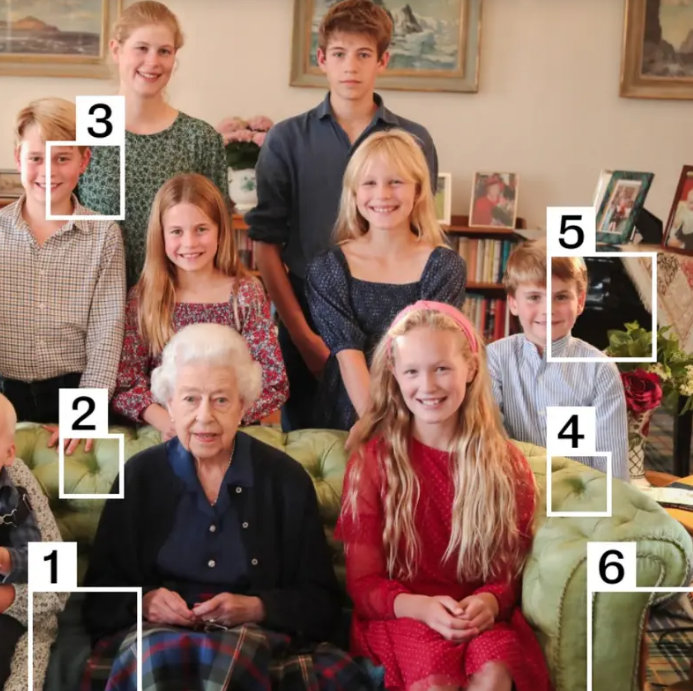وفي اللقطة ظهرت الملكة الراحلة مع لويز ماونتباتن وندسور، وجيمس، وإيرل ويسيكس، ولينا تيندال، والأمير جورج، والأميرة شارلوت، وإيسلا فيليبس، والأمير لويس، وميا تيندال، ولوكاس تيندال، وسافانا فيليبس.