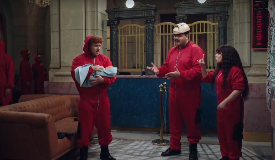 على الجانب الآخر يوجد حزلقوم وأفراد العصابة الأخرين، حيث السيدة الحامل التي أوشكت على الولادة ما يعرض الموجودين داخل البن في ورطة وحالة توتر شديدة، فتقرر مربوحة التصرف سريعا ومساعدة السيدة في الولادة وتطلب من حزلقوم أن يذهب لأفراد الشرطة وطلب منهم بعض الأشياء الخاصة بالولادة لمساعدتها في ذلك وبالفعل تنجح مربوحة وتنجب السيدة ولد في سعادة غامرة لكل المتواجدين في البنك.