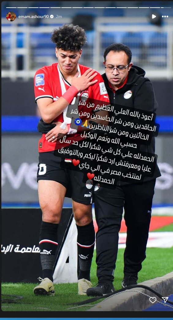 وكتب إمام عاشور بعد تعرضه للإصابة مع منتخب مصر عبر حسابه الرسمي إنستجرام: أعوذ بالله العظيم مش شر الحاقدين ومن شر الحاسدين ومن شر الخائنين.. حسبي الله ونعم الوكيل".