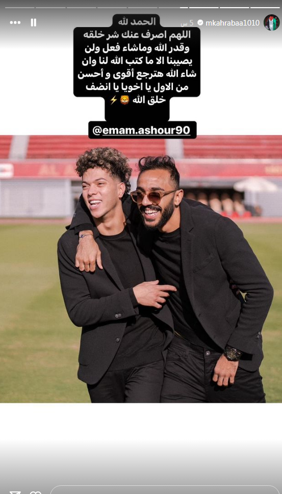 تحيا مصر، وكتب محمود كهربا عبر حسابه الرسمي عبر إنستجرام لإمام عاشور: اللهم اصرف عنك شر خلقه وقدر الله وما شاء فعل .. هترجع اقوى وأحسن من الأول يا اخويا يا انضف خلق الله".