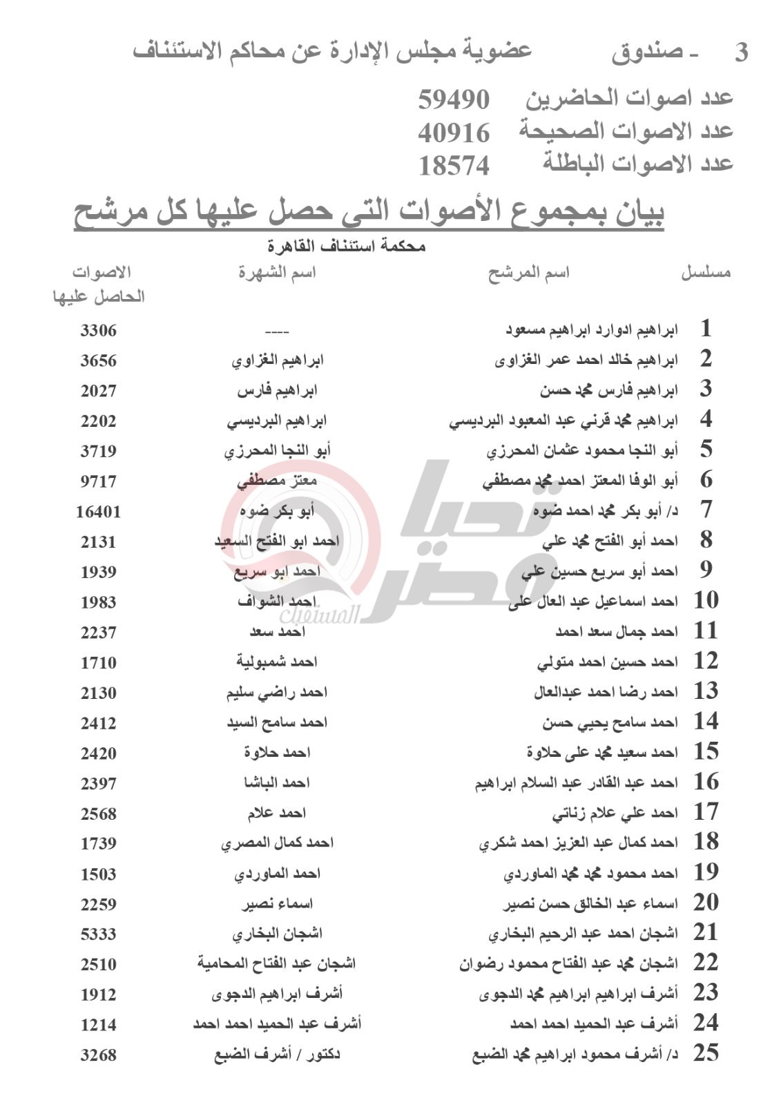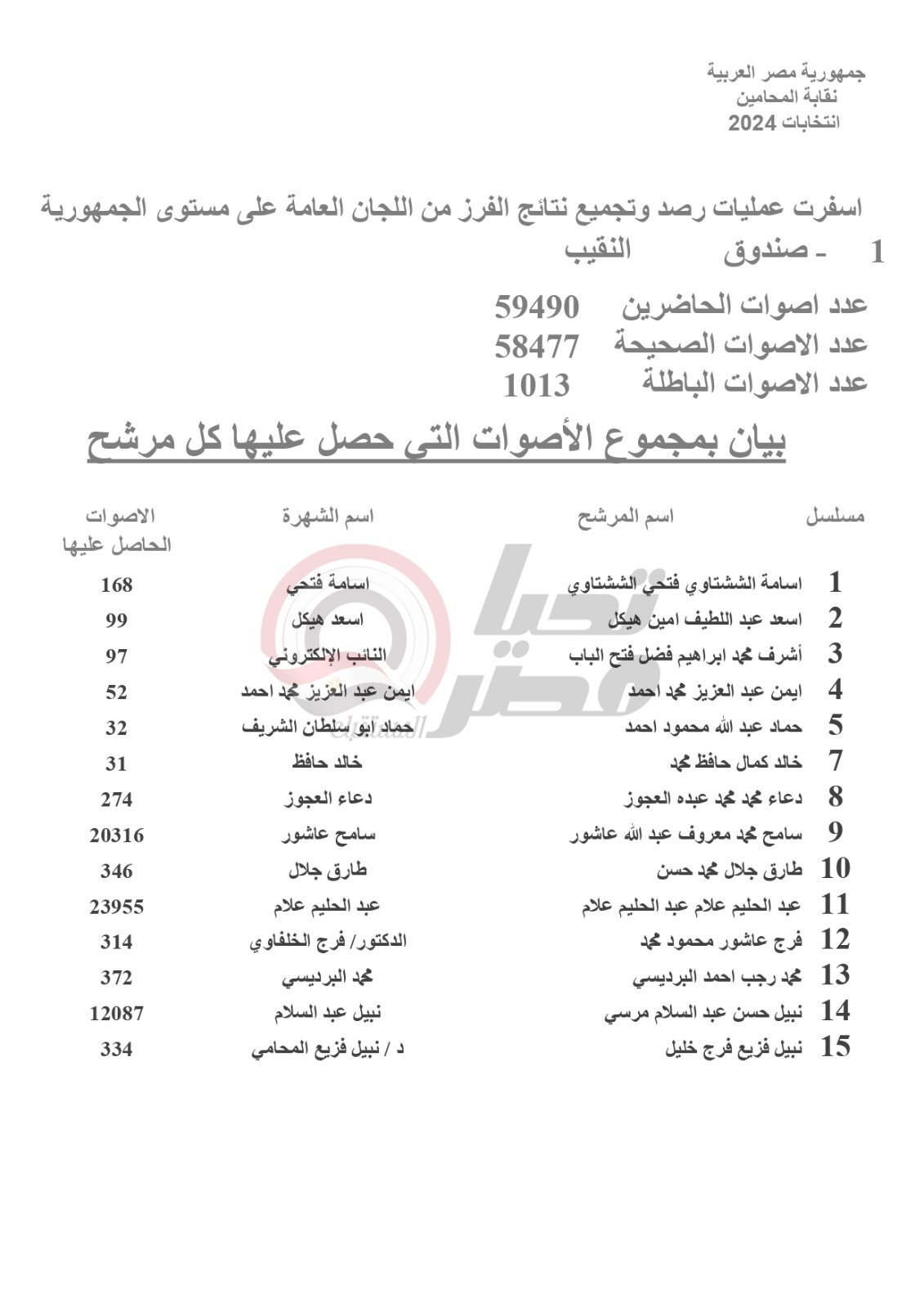 وأعلنت اللجنة المشرفة على انتخابات نقابة المحامين 2024، عن أن عمليات رصد وتجميع نتائج الفرز من اللجان العامة على مستوى الجمهورية بصندوق النقيب عن عدد 59490 صوت للحاضرين، وعدد 58477 صوت صحيح، و1013 صوت باطل.
