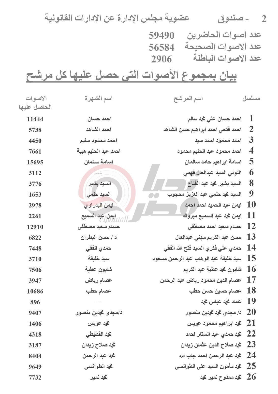 وتضمنت نتيجة التصويت حصول كلا من أسامة الشتتاوي على عدد 168 صوت، وأسعد أمين 99 صوت، وأشرف محمد فتح الباب 97 صوت، وايمن عبدالعزيز 52 صوت، وحماد عبدالله 32 صوت، وخالد كمال 31 صوت، دعاء محمد 274 صوت، وسامح عاشور 20 ألف و316 صوت وطارق جلال 346 صوت، وعبدالحليم علام 23 ألف صوت، وفرج عاشور 314 صوت، ومحمد رجب البرديسي 372 صوت، ونبيل مرسي 12 ألف 87 صوت، ونبيل خليل 334 صوت، وبالتالي فوز عبدالحليم علام بمنصب النقيب العام.
