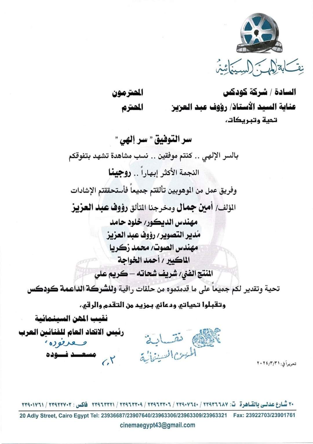 أصدرت نقابة المهن السينمائية برئاسة مسعد فودة رئيس الاتحاد العام للفنانين العرب، بيان تتوجه فيه بالتحية والتقدير لصناع مسلسل سر إلهي بطولة الفنانة المصرية روجينا والذي يعرض خلال السباق الرمضاني الجاري 2024.
