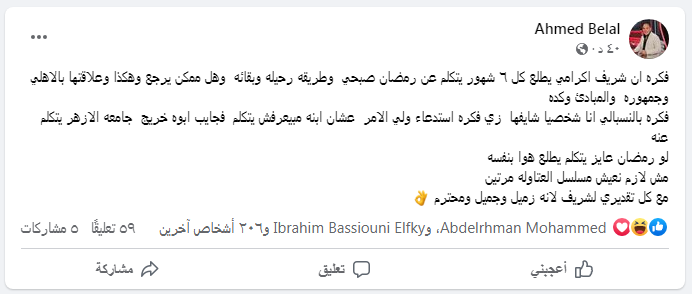وكتب أحمد بلال عبر حسابه الشخصي على فيس بوك: «فكرة ان شريف اكرامي يطلع كل ٦ شهور يتكلم عن رمضان صبحي وطريقه رحيله وبقائه وهل ممكن يرجع وهكذا وعلاقتها بالأهلي وجمهوره والمبادئ وكده».