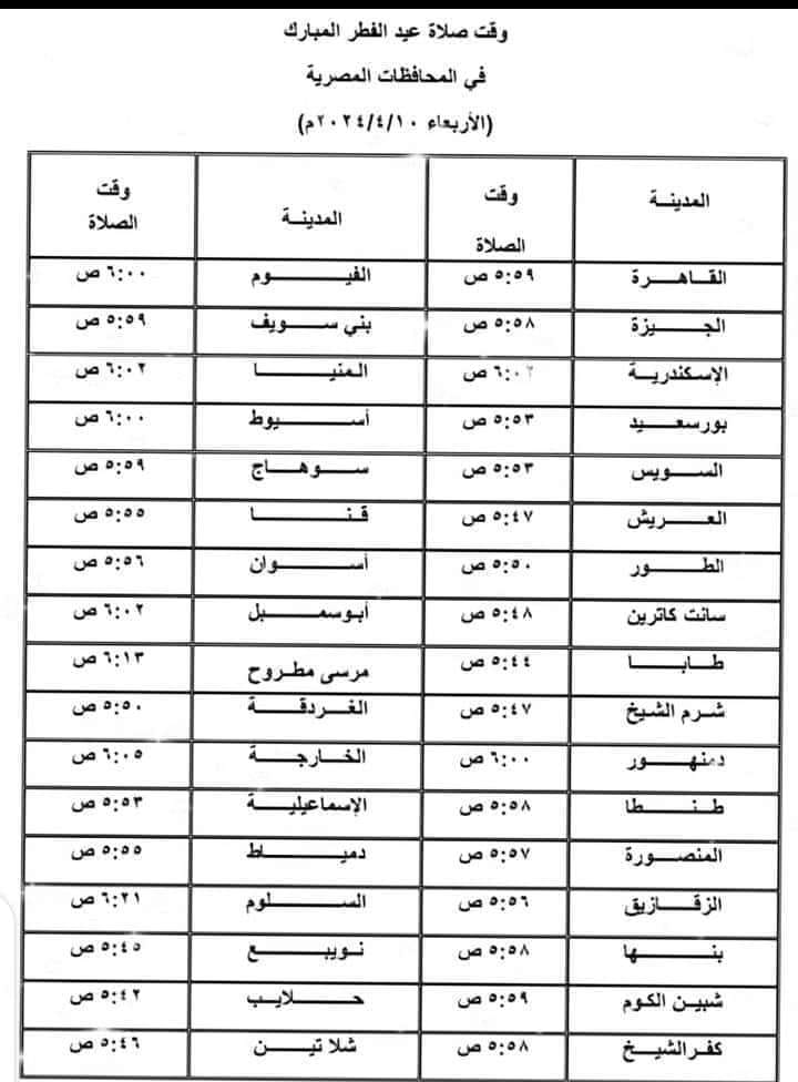 - صلاة عيد الفطر المبارك في طنطا وبنها وكفر الشيخ في الساعة 5:58 صباحًا.