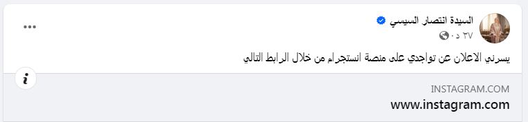 وكتبت السيدة انتصار السيسي، على صفحتها الشخصية على فيس بوك: " يسرني الاعلان عن تواجدي على منصة انستجرام".