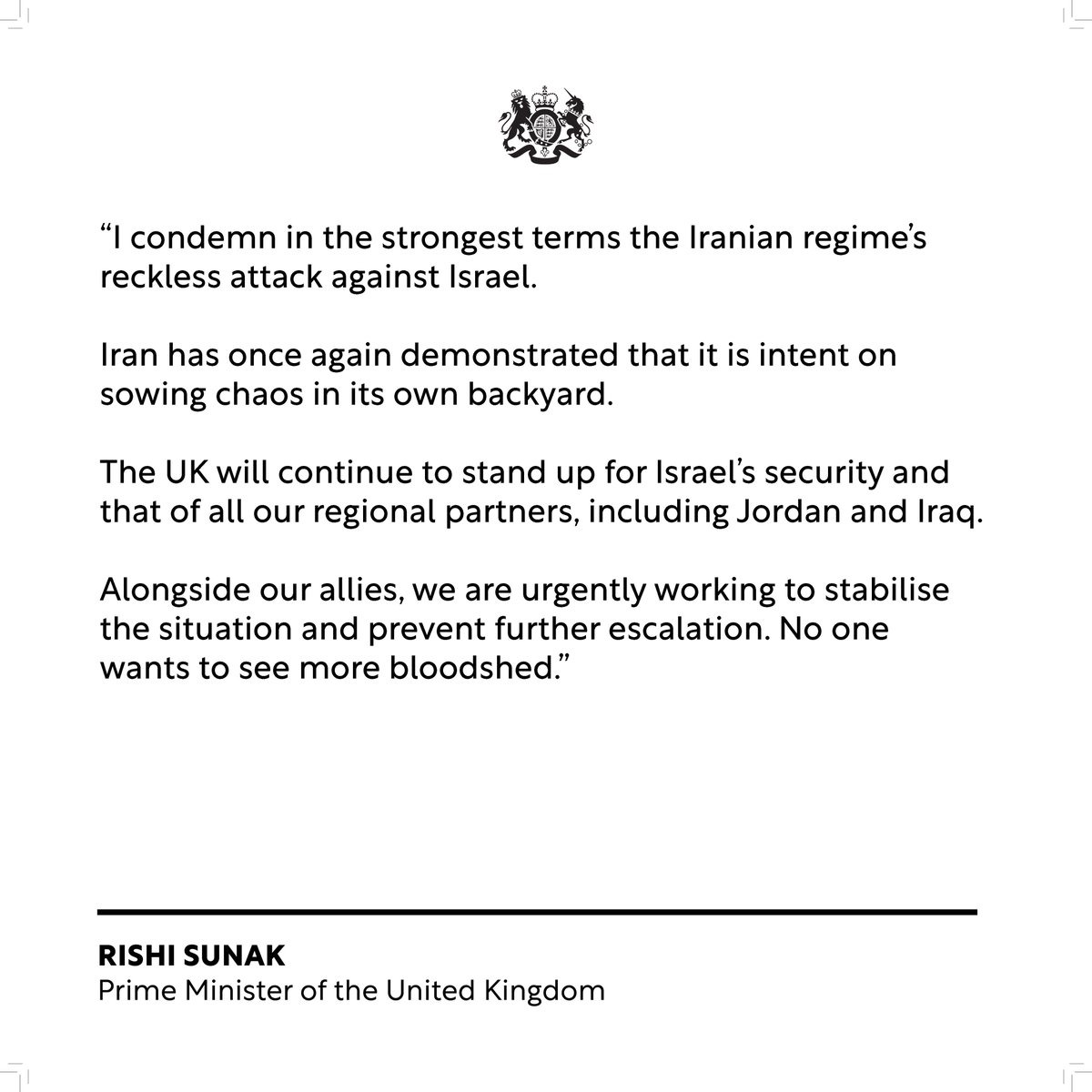 وقال رئيس وزراء بريطانيا سوناك في بيان: "أدين بأشد العبارات الهجوم المتهور الذي قام به النظام الإيراني ضد إسرائيل.