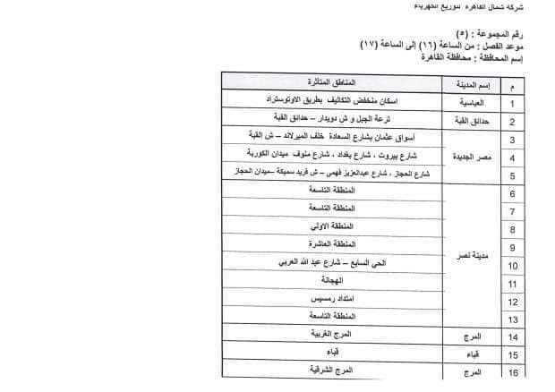ومناطق الساحل الشمالي والعلمين، وجميع المناطق الصناعية ومصانع الأسمدة بمختلف المناطق على مستوى الجمهورية