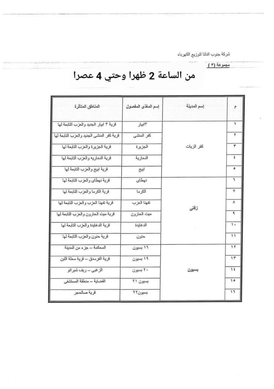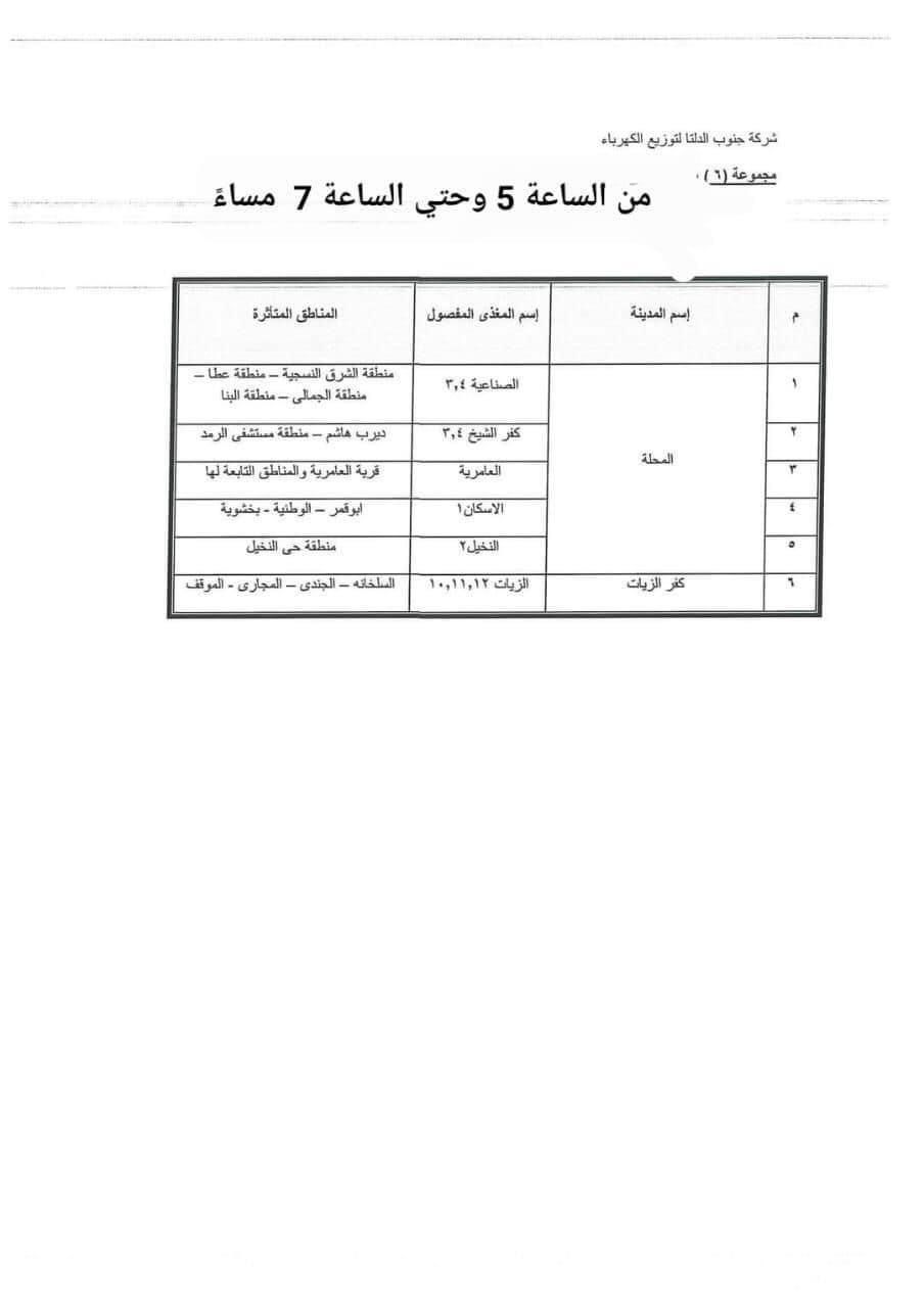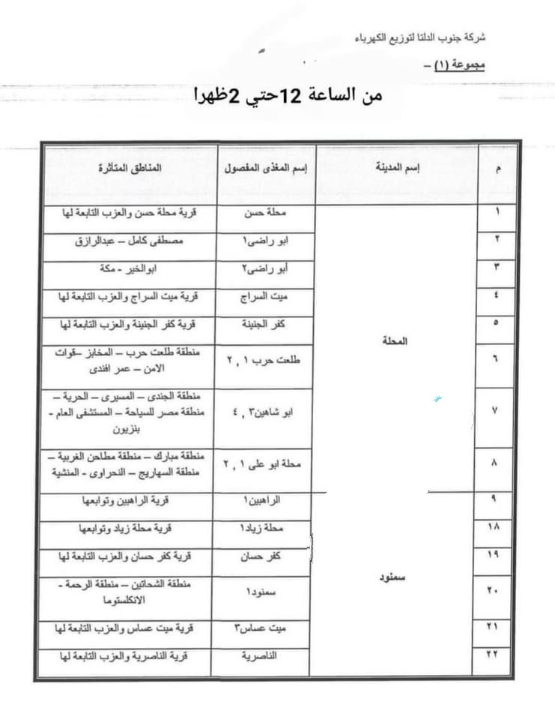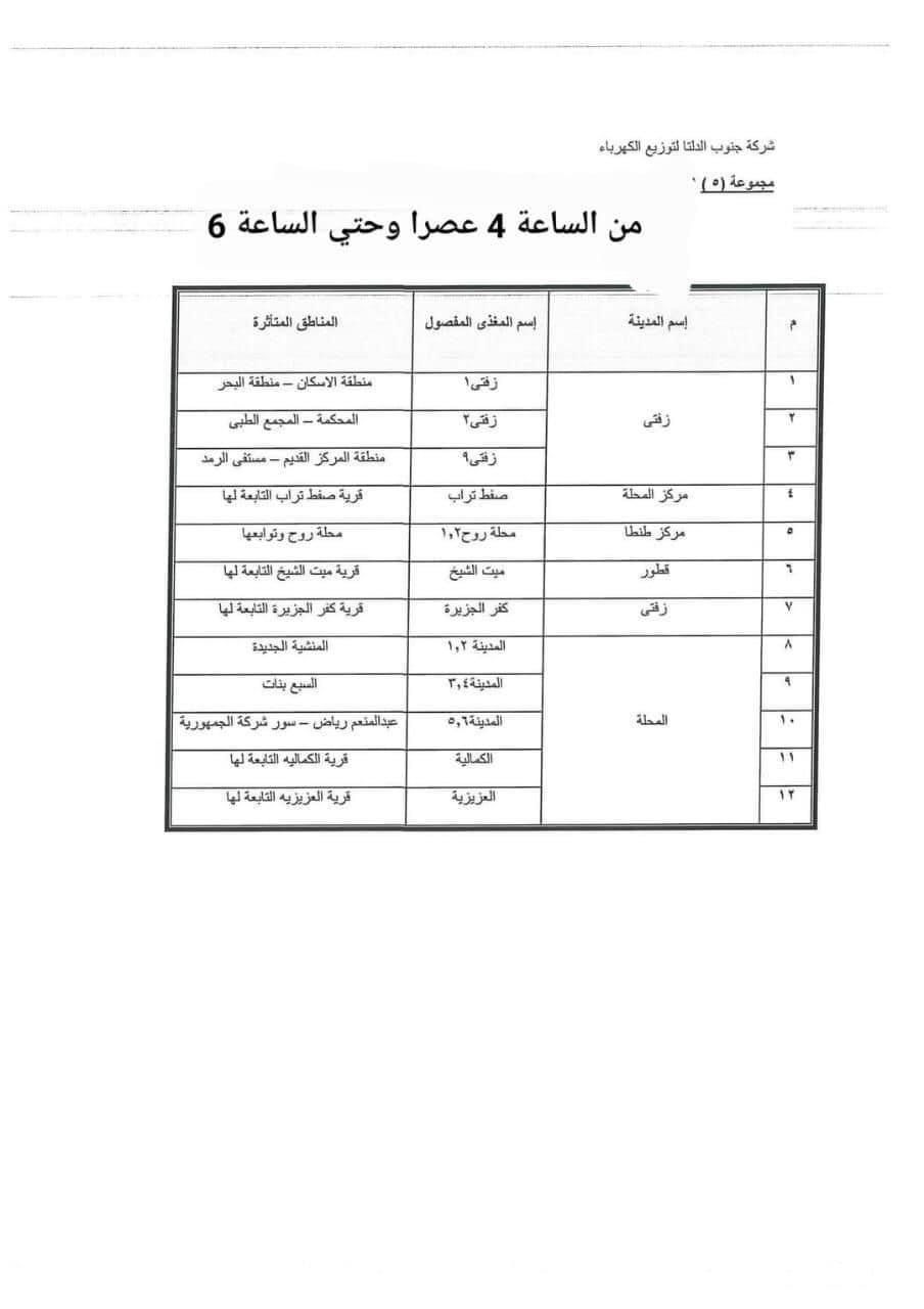 حيث سيتم قطع الكهرباء في كل من مركز كفر الزيات وزفتى وبسيون من الساعة الـ2 ظهرا وحتى الـ4 عصرا، فيما يتم قطع الكهرباء في المحلى الكبرى وطنطا في حوالي الساعة الواحدة ظهرا إلى الساعة الـ3 عصرا.