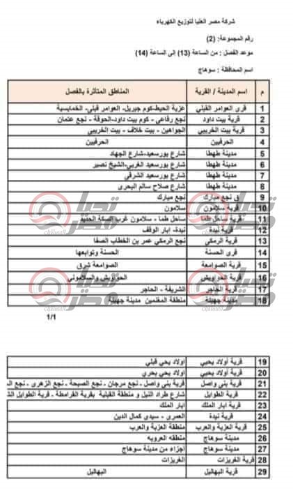 تم تقسم وتوزيع الجدول الي مجموعات لفصل التيار الكهربائى بمحافظة سوهاج في المجموعة (الاولي ) من الساعة 12 مساءً وحتى الساعة 1 مساءً والمتمثلة في مدينة جهينة وتوابعها من ( جهينة الشرقية، ونجع الضبع، ونجع أولاد أبوزيد، ونجع غزالي، ومنطقة شقة النزلة، ومدينة جهينة، ومنطقة رشوان، وشارع جمال عبد الناصر، ونجع عزوز، وقرية كوم الصعايدة، وقرية نجع عويس، وقرية بندار الغربية، وقرية أولاد غازي، وقرية الترامزة، وقرية باجا، وقرية الحمادية، وقرية الشوكة، وقري مبارك، وقرية الغريزات، ووقرية القوصية، وقرية أولاد خلف، ومدينة المراغة، وقرية أم دومة).