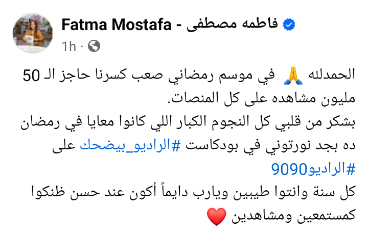 وكتبت فاطمة مصطفى في منشور رصده موقع تحيا مصر في الدقائق القليلة الماضية، احتفالا بنجاح برنامج الراديو بيضحك: الحمدلله في موسم رمضاني صعب كسرنا حاجز الـ 50 مليون مشاهده على كل المنصات, بشكر من قلبي كل النجوم الكبار اللي كانوا معايا في رمضان ده بجد نورتوني في بودكاست الراديو ليضحك على الراديو 9090.. كل سنة وانتوا طيبين ويارب دايماً أكون عند حسن ظنكوا كمستمعين ومشاهدين.