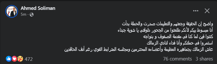 وأختتم قائلاً:" عاش الزمالك بجماهيره العظيمة وأعضاءه المحترمين ومجلسه المترابط القوي رغم أنف الحاقدين".