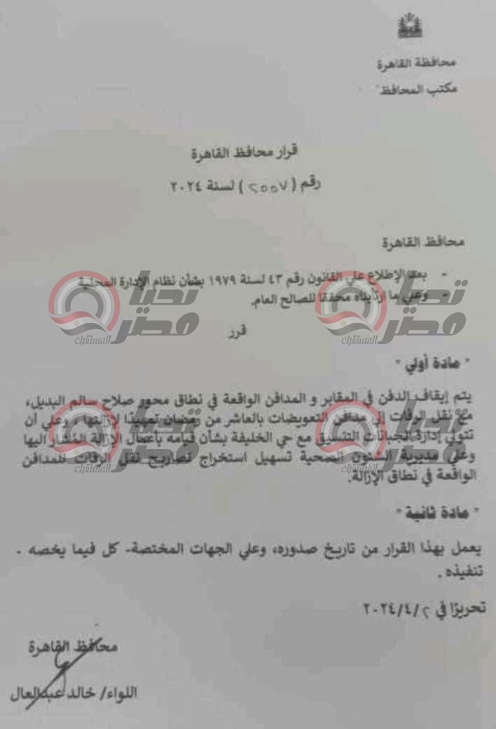 وتضمن القرار، الذي حصل تحيا مصر على نسخة منه، أنه تتولى إدارة الجبانات التنسيق مع حي الخليفة بشأن قيامه بأعمال إزالة المقابر والمدافن الواقعة في نطاق صلاح سالم البديل، وعلى مديرير الشئون الصحية تسهيل استخراج تصاريح نقل الرفات للمدافن الواقعة في نطاق الإزالة.