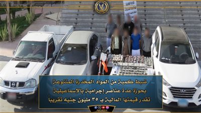 وايضا ضبط (3 عاطلين - لأحدهما معلومات جنائية) بدائرة مركز شرطة أبو صوير، وبحوزتهم (35 كيلو جرام لمخدر الحشيش، هذا وتقدر القيمة المالية للمواد المخدرة المضبوطة بـ (35 مليون جنيه تقريباً، تم إتخاذ الإجراءات القانونية.