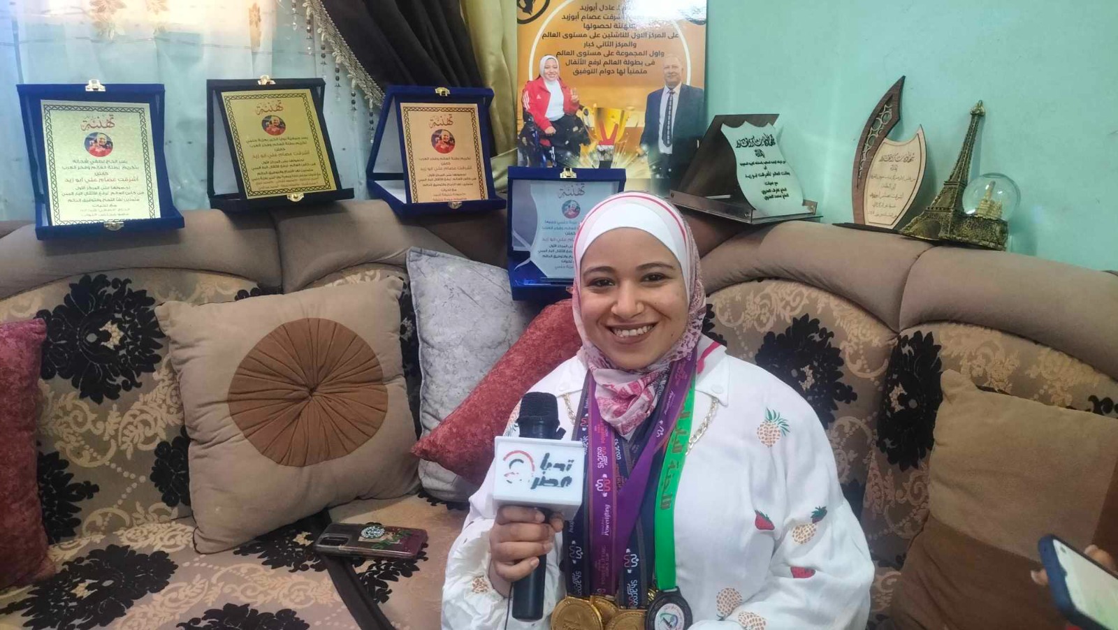 وتابعت بطلة العالم أشرقت عصام، بأنها شاركت لأول مرة في بطولة العالم التي أقيمت في شرم الشيخ يوم 20 من شهر مارس الماضي وتمكنت من الحصول على المركز الأول وميداليتين ذهب، على الرغم من مرورها بأزمة صحية مفاجئة وشعورها ببعض التوتر والقلق، ولكن كانت تسيطر عليها الإرادة في تحقيق المركز الأول، وشرفت أبناء قريتها بالكامل.
