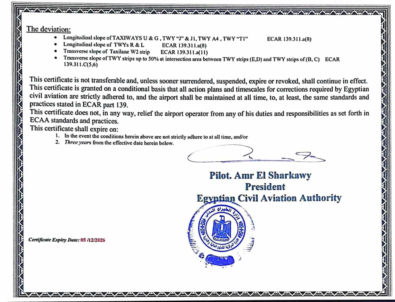 جدير بالذكر أن المطارات المصرية تخضع للتفتيش الدورى من قبل سلطة الطيران المدنى المصرى، للتأكد من التزامها بتطبيق كافة الشروط والمعايير الدولية.