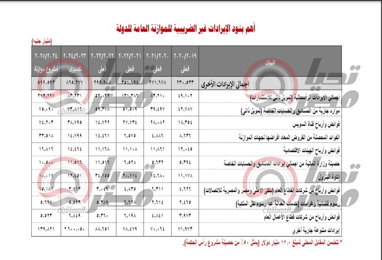 وتضمن مشروع الموازنةالإيرادات الأخرى غير الضريبة حيث تأكيد الحكومة علي أنها تعمل اعلى تنمية وتنويع مصادر إيرادات الدولة الغير ضريبية تأكيدًا على أن السياسة المالية غير قائمة على فرض أعباء جديدة أو إضافية ولكتها قائمة بالأساس على اتخاذ إجراءات لتعزيز العدال الضريبية وتنويع مصادر الإيرادات غير الضريبية واستئداء حقوق الخزانة العامة من العوائد على الأصول المملوكة من خلال تنفيذ إصلاحات هدفها تحسين الأوضاع المالية والاقتصادية للشركات والهيئات العامة الاقتصادية.