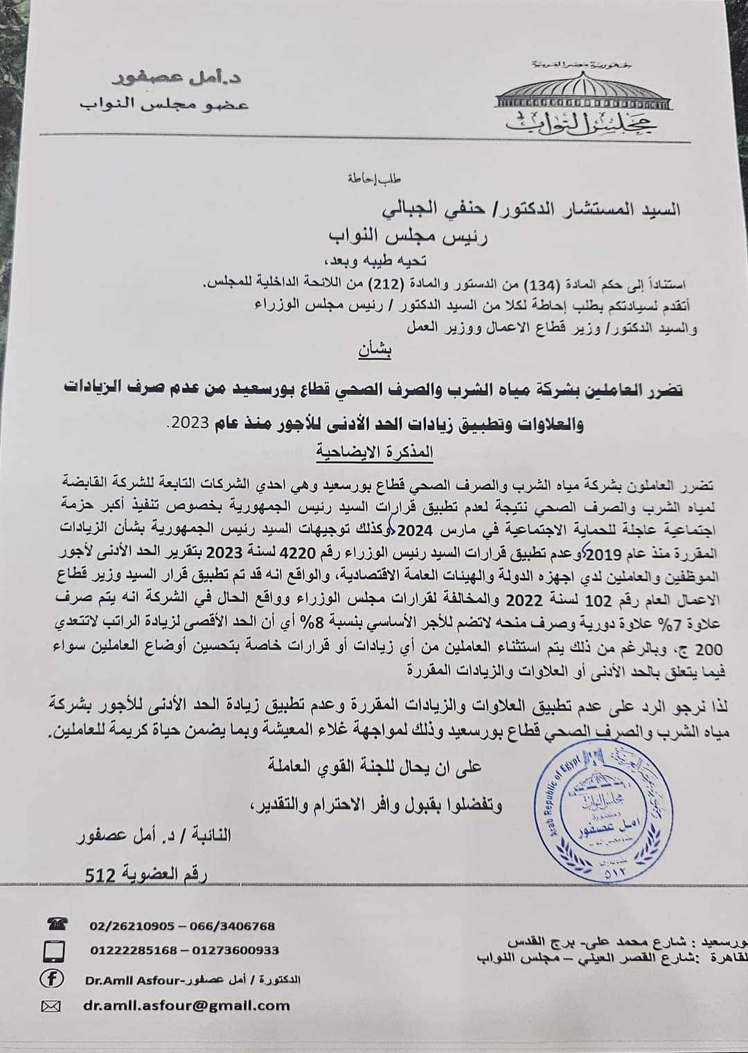تقدمت النائبة أمل عصفور، أمين سر لجنة التعليم والبحث العلمي بمجلس النواب، بطلب إحاطة للمستشار الدكتور حنفي جبالي رئيس مجلس النواب موجه للدكتور مصطفى مدبولي رئيس مجلس الوزراء، ووزير قطاع الأعمال، ووزير العمل بشأن تضرر العاملين بشركة مياه الشرب والصرف الصحي قطاع بورسعيد من عدم صرف الزيادات والعلاوات وتطبيق زيادات الحد الأدنى للأجور منذ عام 2023.