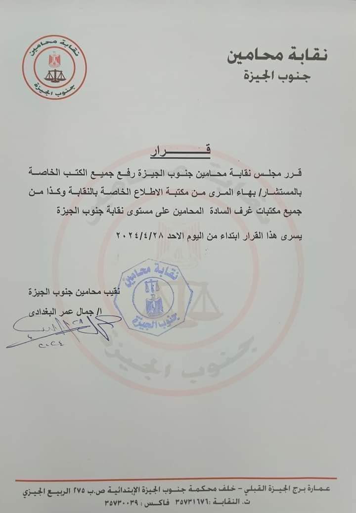 قرر مجلس نقابة محامين جنوب الجيزة رفع جميع الكتب الخاصة بالمستشار بهاء المرى من مكتبة الإطلاع الخاصة بالنقابة وكذا من جميع مكتبات غرف المحامين على مستوى نقابة جنوب الجيزة