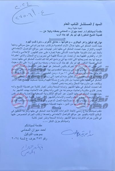 وذكر المحامي في البلاغ المقدم، أنه قد قامت المشكو في حقها خلال الأيام الماضية بارتكاب عدة جرائم في حق موكلي ومنها التهديد والابتزاز حيث تعمدت المشكو في حقها نشر تهديدات عبر مواقع التواصل الاجتماعي باتخاذ إجراءات قانونية عقابية ضد الشاكي بغية إجباره على عدم الظهور الإعلامي وإصدار الآراء والفتاوى أن تحدث عن مسألة فقهية في تحريم زواج المطل والذي اعتبرته في برنامج العرافة كما قامت المشكو في حقها بسب موجها لها بعد الشاكي فضيلة النبي صلى الله عليه يد الرب بسبه ووصفه ب ( ليس ) ردا على ذكره حيث من المستعار هو المحل فلمن الله المحل والمحلل له.