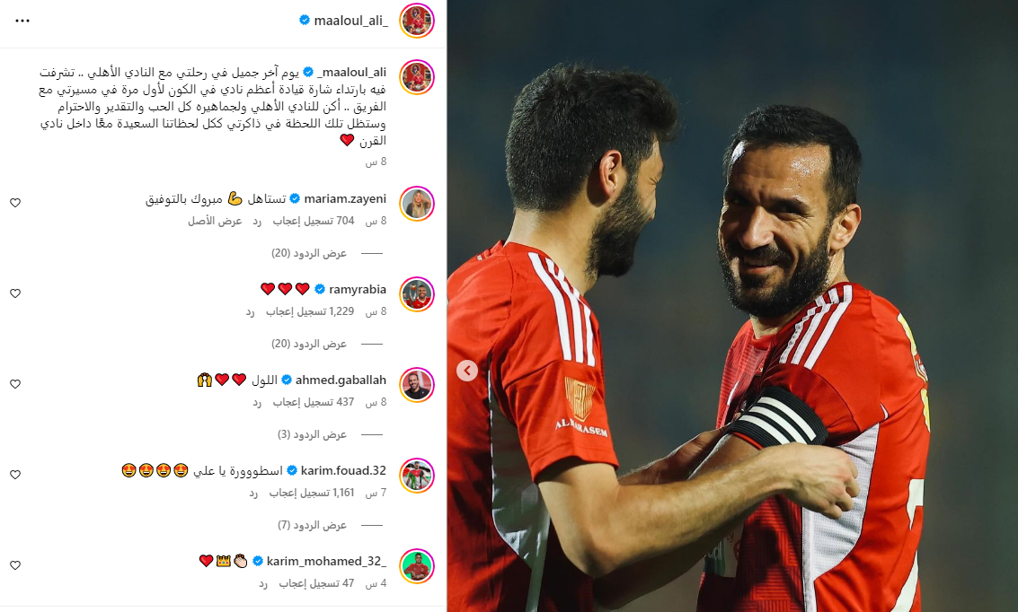 وكتب علي معلول على حسابه الرسمي إنستجرام:" : يوم آخر جميل في رحلتي مع النادي الأهلي .. تشرفت فيه بارتداء شارة قيادة أعظم نادي في الكون لأول مرة في مسيرتي مع الفريق".