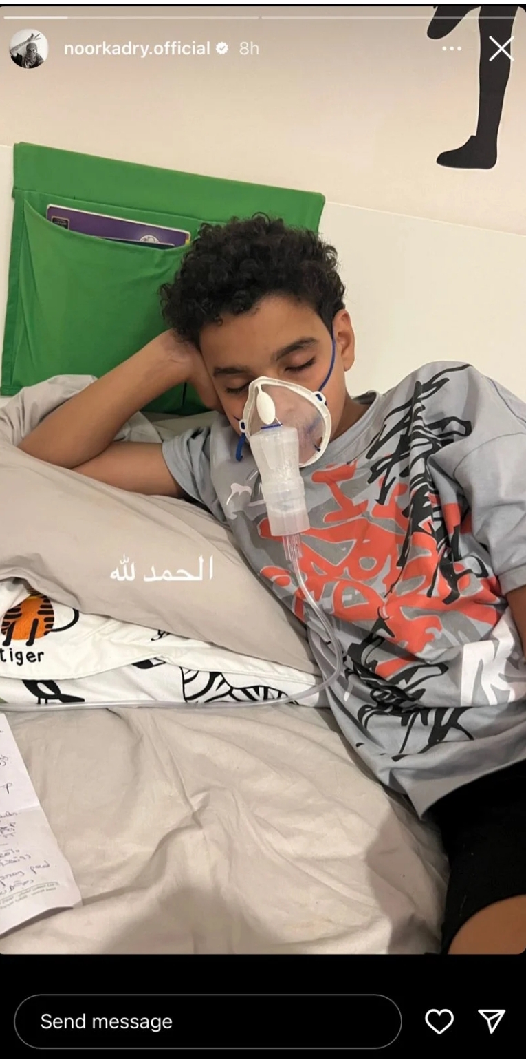 كشفت الفنانة نور قدري عبر حسابها الرسمي بموقع الإنستجرام بمنشور رصده موقع تحيا مصر عبر خاصية الإستوري، حيث نشرت صورة لأبنها وهو نائم ويضع جهاز البخار وعلقت عائلة قائلة: "الحمد للة".