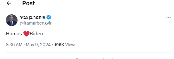 وكتب بن غفير منشورا رمز فيه إلى "حب" حركة حماس للرئيس بايدن بعد تصريحات الأخير الذي هدد فيه إسرائيل بوقف إمدادات أسلحة في حال واصلت عمليتها في رفح.