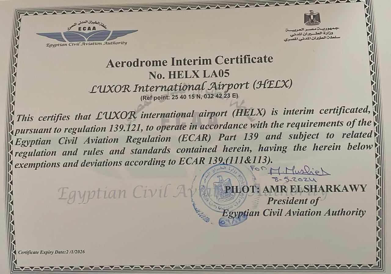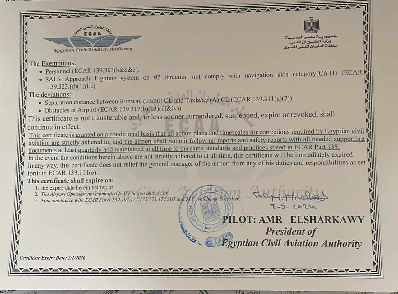 شهادة ترخيص مطار الاقصر الدولى للعمل كمطار دولى لمدة ٣ أعوام