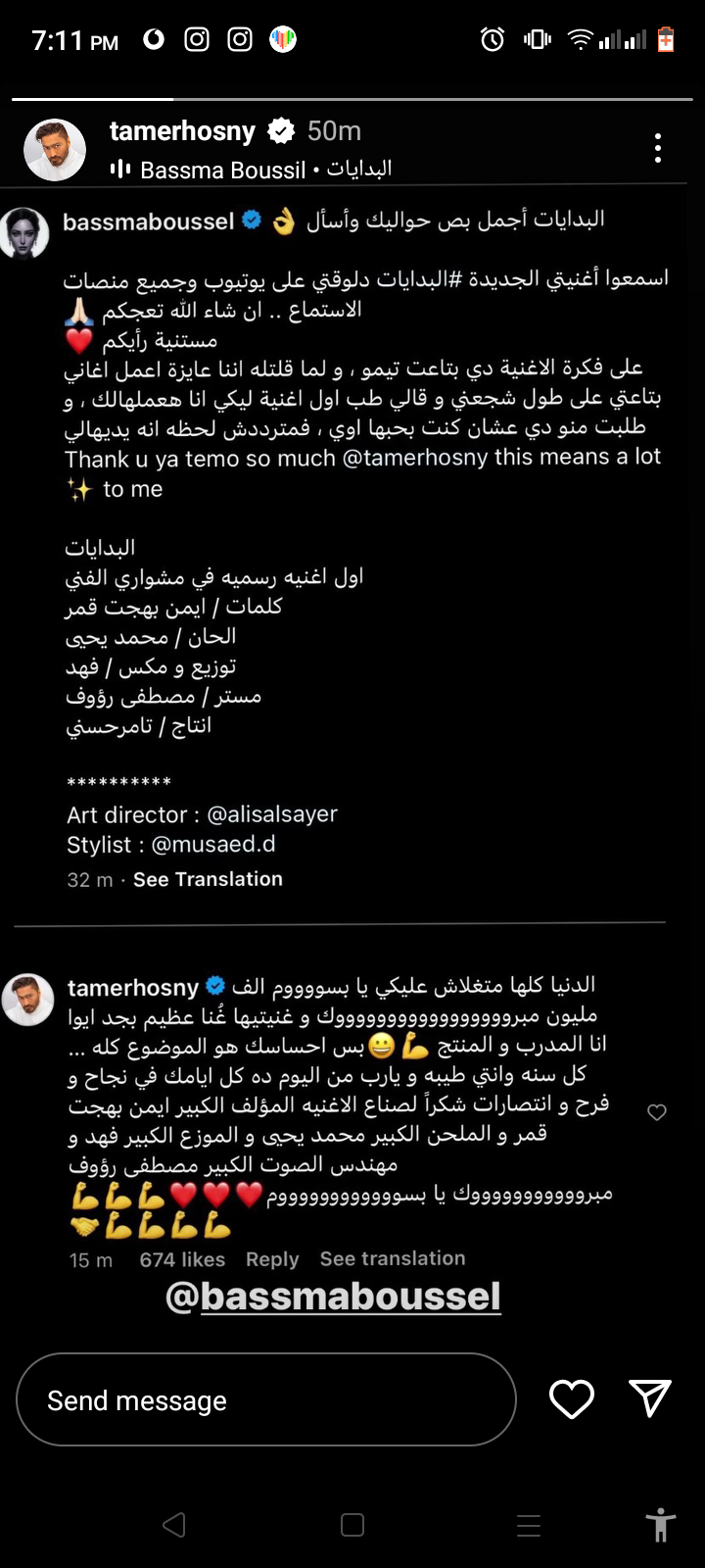 وتابعت بسمة بوسيل حديثها: على فكرة الأغنية دي بتاعت تيمو، ولما قلتله إني عايزة أعمل أغاني ليا على طول شجعني وقالي طب أول أغنية ليكي أنا هعملهالك، وطلبت منه دي عشان كنت بحبها أوي، فمترددش لحظه إنه يديهالي، ودي أول أغنية رسمية في مشواري الفني.