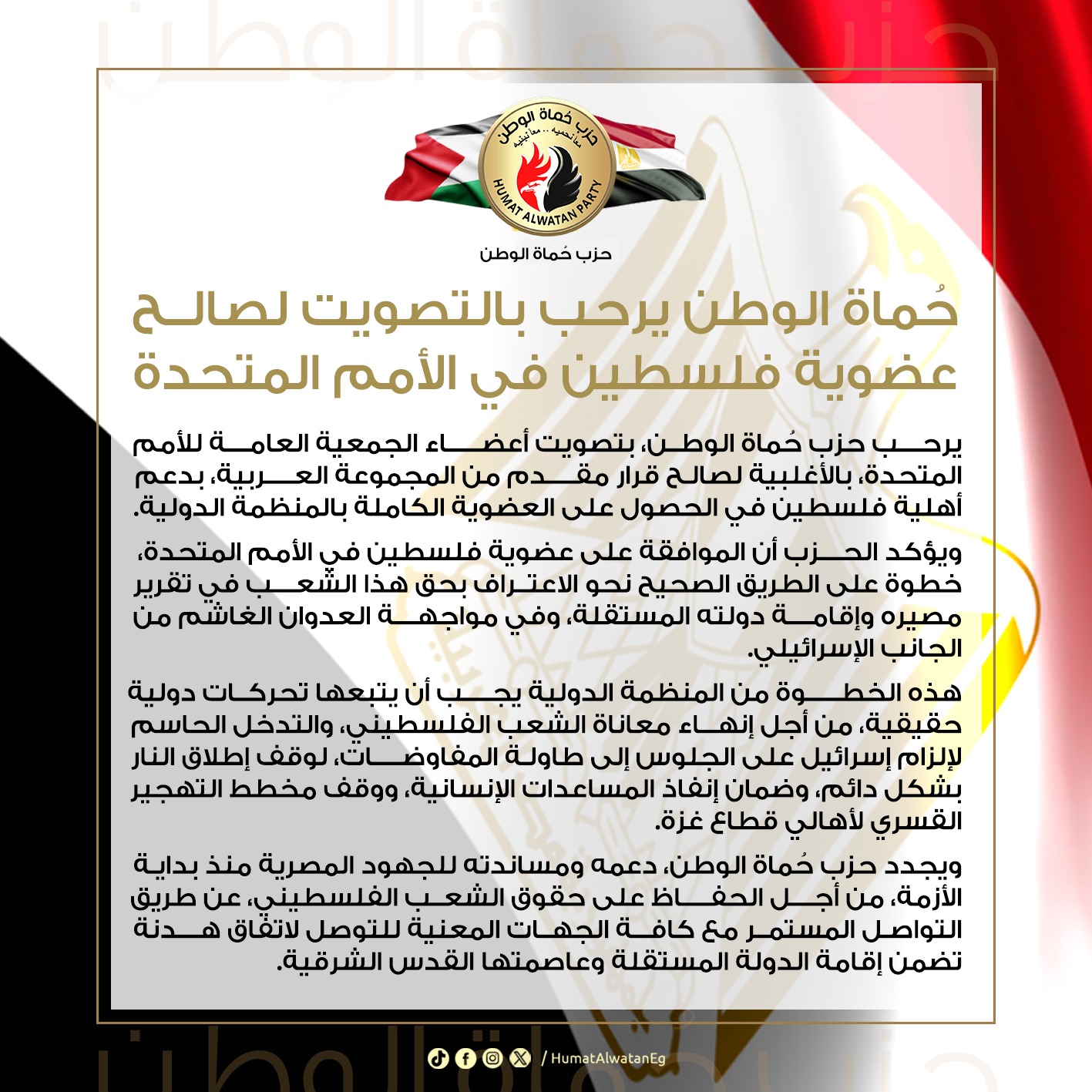 رحب حزب حماة الوطن، بتصويت أعضاء الجمعية العامة للأمم المتحدة، بالأغلبية لصالح قرار مقدم من المجموعة العربية، بدعم أهلية فلسطين في الحصول على العضوية الكاملة بالمنظمة الدولية.
