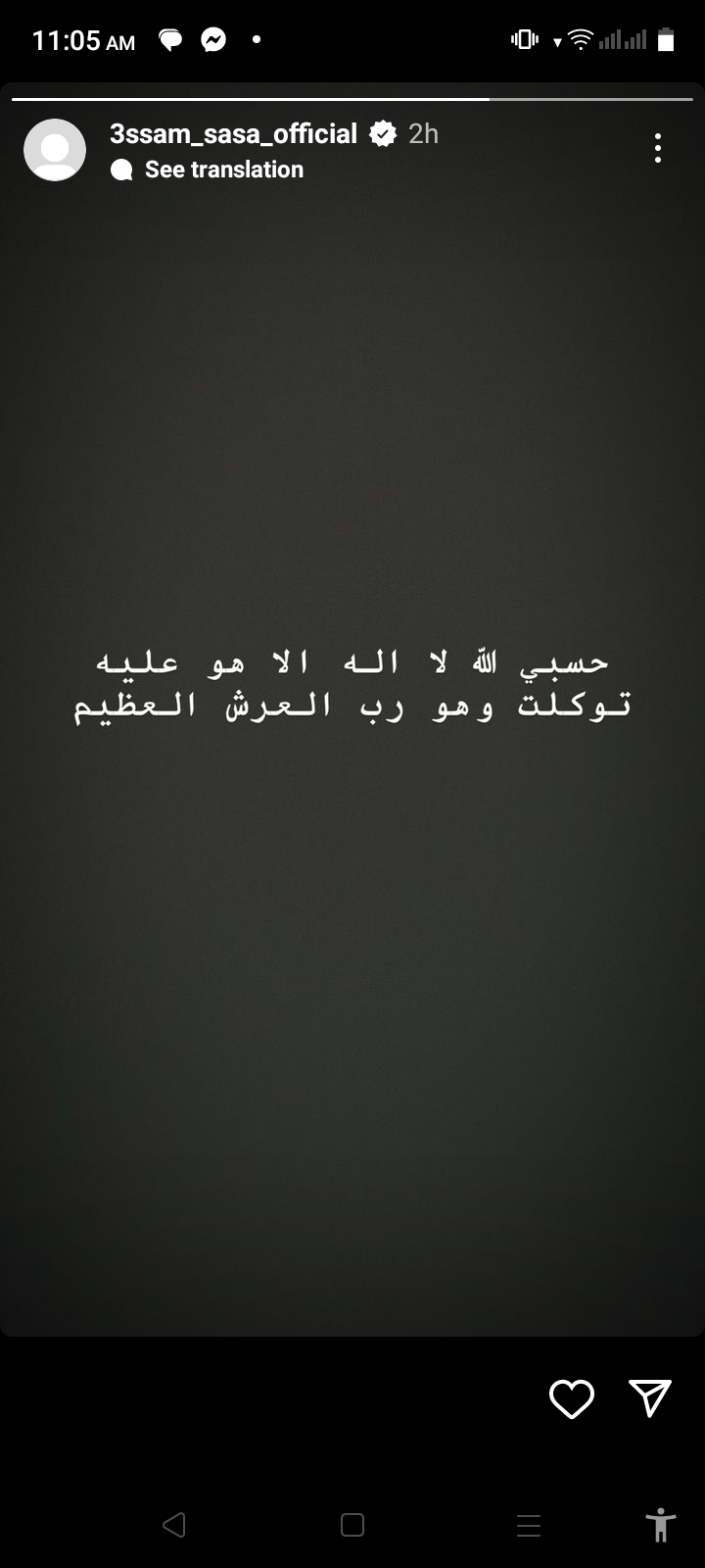 وفي أول تعليق من مطرب المهرجانات الشعبية عصام صاصا حول تلك الأزمة اكتفى بالتعليق على خاصية ستوري بموقع تبادل الصور والفيديوهات انستجرام في منشور رصده موقع تحيا مصر: "حسبي الله لا اله الا هو عليه توكلت وهو رب العرش العظيم".