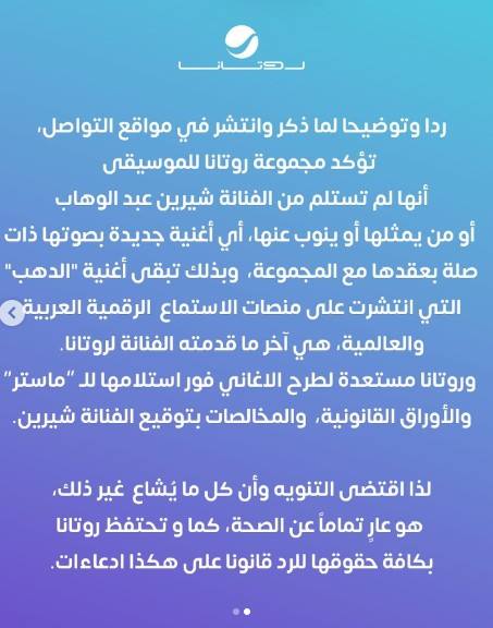 وأضافت روتانا في بيانها: وبذلك تبقى أغنية الذهب والتي نشرت على منصات الاستماع الرقمية العربية والعالمية، هي آخر ما قدمته الفنانة لروتانا، وروتانا مستعدة لطرح الأغاني فور استلامها للماستر والأوراق القانونية والمخالصات بتوقيع الفنانة شيرين، لذا اقتضى التنويه، وأن كل ما يشاع غير ذلك، هو عار تماما عن الصحة، كما وتحتفظ روتانا بكافة حقوقها للرد قانونا على هذه الإدعاءات.