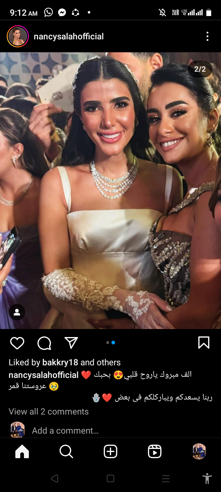 وحرصت الفنانة نانسي صلاح على نشر مجموعة صور جديدة من حفل زفاف ريم سامي وذلك على حسابها الرسمي بموقع تبادل الصور والفيديوهات انستجرام، في منشورات رصدها موقع تحيا مصر وهنأت من خلالها صديقتها المقربة ريم سامي، قائلة: "ألف مبروك يا روح قلبي.. عروستنا قمر بحبك، ربنا يسعدكم ويباركلم في بعض".