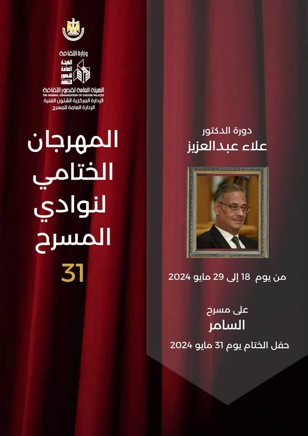 يتضمن حفل افتتاح المهرجان الختامي لنوادي المسرح وفقا لما رصده موقع تحيا مصر كلمات افتتاحية وعرض فيلم تسجيلي عن د. علاء عبد العزيز، ثم تنطلق عروض المهرجان الذي يقام بإشراف الإدارة المركزية للشئون الفنية برئاسة الفنان تامر عبد المنعم، والإدارة العامة للمسرح برئاسة سمر الوزير، ويشارك به 24 عرضا مسرحيا تقدم مجانا للجمهور، وتتكون لجنة التحكيم من المخرج هشام عطوة رئيسا، وعضوية كل من د. محمد سمير الخطيب، د. حمدي عطية، والموسيقار أحمد حمدي رؤوف، والمخرج سامح مجاهد، ومقرر اللجنة ومدير المهرجان المخرج محمد الطايع.
