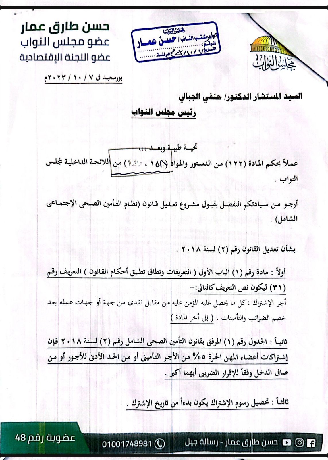 أحال المستشار الدكتور حنفي جبالي رئيس مجلس النواب، في بداية الجلسة العامة للمجلس، مشروع قانون مُقدم من النائب حسن طارق عمار، وآخرين (أكثر من عُشر عدد أعضاء المجلس)، بتعديل بعض أحكام قانون نظام التأمين الصحي الشامل الصادر بالقانون رقم 2 لسنة 2018، إلى لجنة مشتركة من لجان الشئون الصحية، الشئون الدستورية والتشريعية، والخطة والموازنة).