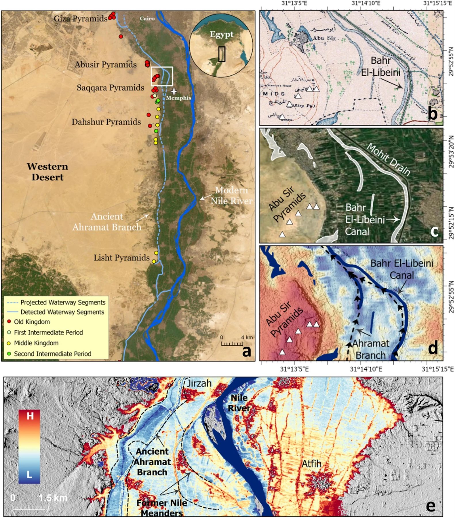 واكتشف فريق بحث من جامعة نورث كارولينا ويلمنغتون، أن الأهرامات ربما تكون قد شُيّدت على طول فرع قديم لنهر النيل لم يعد موجوداً منذ زمن طويل، والذي تغطيه اليوم الصحراء والأراضي الزراعية.