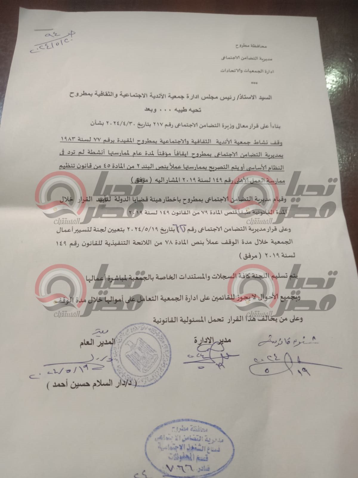 وسرد الممثل القانوني للجمعية، أزمة جمعية الأندية الثقافية والاجتماعية المعروفة بـ النادي الاجتماعي، ومدير التضامن الاجتماعي بمطروح.