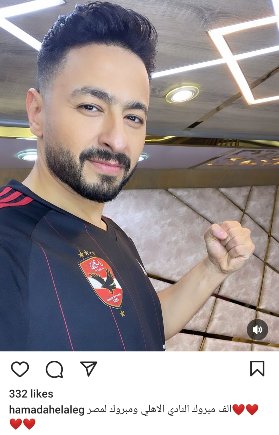 احتفل الفنان حمادة هلال بفوز النادي الأهلي في نهائي دوري أبطال أفريقيا حيث شارك صورة عبر حسابه الرسمي على موقع تبادل الصور والفيديوهات انستجرام يرصده موقع تحيا مصر وهو يرتدي تي شيرت النادي الأهلي وفي الخلفية أغنية والله وعملوها الرجالة وعلق: "الف مبروك النادي الأهلي ومبروك لمصر"، وانهالت التعليقات على منشور حمادة هلال من جمهوره ومحبيه مهنئين النادي الأهلي بالفوز.