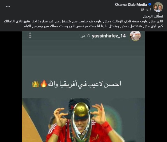 وكان أسامة دياب قد نشر رسالة في بدايتها نسألك الرحيل، واللي مش عارف قيمة نادي الزمالك ومش عارف هو بيلعب فين يتفضل من غير مطرود واللي بيمثل علينا وبستحقر نفسي أني وقفت معاك في يوم من الأيام.