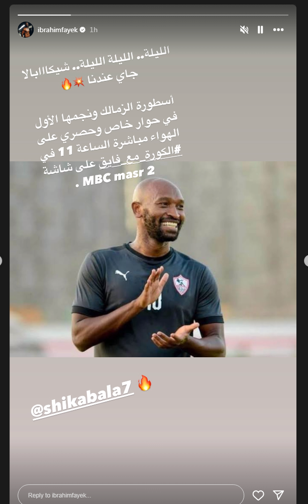 تحيا مصر، ويذاع لقاء محمود شيكابالا قائد فريق الزمالك مع الإعلامي إبراهيم فايق، اليوم الثلاثاء، في تمام الساعة الحادية عشر مساءً، على قناة mbc مصر 2.