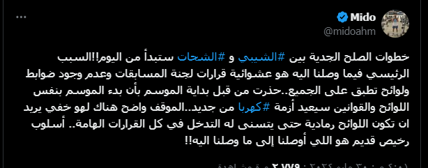 ونشر ميدو عبر حسابي الشخصي على منصة “X” ، وقال: أنه الآن سوف تبدأ المحاولات من أجل تقارب الآراء، والصلح فيما بين، حسين الشحات ومحمد الشيبي، وأن ما تم الوصول إليه من تصاعد الأزمة، بسبب عدم وجود لوائح وقوانين صارمة، تطبق على الجميع من قبل لجنة الانضباط، إلى جانب عشوائية القرارات، التي يتم اتخاذها".