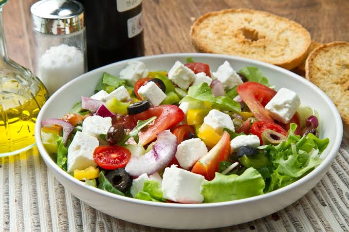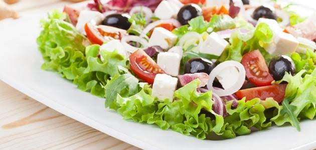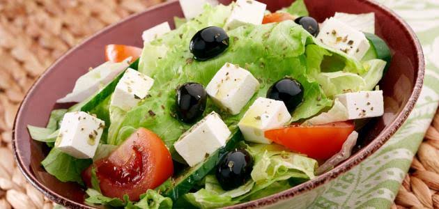 السلطة اليونانية وتشمل هذه السلطة الخيار والطماطم والفلفل الأخضر والبصل الأحمر والزيتون والجبن والليمون.