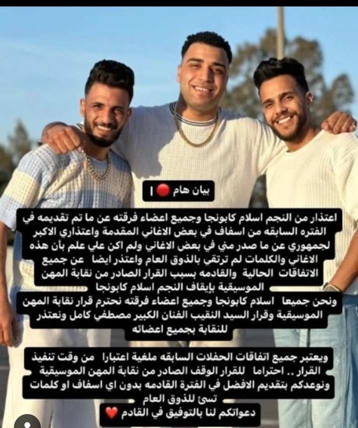 واختتم اسلام كابونجا حديثه: يعتبر جميع اتفاقات الحفلات السابقة ملغية اعتبارًا من وقت تنفيذ القرار، احترامًا للقرار الوقف الصادر من نقابة المهن الموسيقية، ونوعدكم بتقديم الأفضل في الفترة القادمة بدون أي إسفاف أو كلمات، تسيئ للذوق العام دعواتكم لنا بالتوفيق في القادم.
